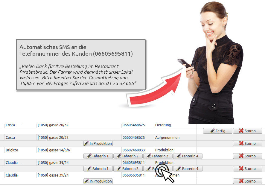 Optionales SMS direkt über die Bestellliste versenden.